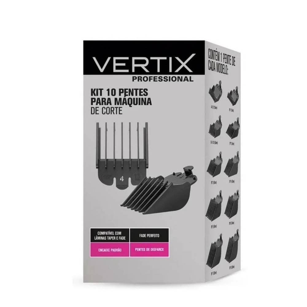Este kit oferece 10 pentes com diferentes alturas para cortes mais personalizados, incluindo dois pentes de disfarce. Os pentes e lâminas das máquinas são peças fundamentais para a execução de diversos tipos de cortes; pensando nisso, a marca Vertix lança um kit completo com 10 modelos de pentes de altura, ideais para personalizar os cortes de cabelo e proporcionar melhor acabamento. O grande diferencial é que eles são compatíveis com as máquinas Vertix X8800, X8900 e também com modelos de mercado com lâminas taper e fade. Lembre-se de verificar se o pente está encaixado corretamente na máquina antes de iniciar o uso. A Vertix Professional é uma marca criada de profissional para profissional, que busca potencializar o talento e conectar o profissional com tendências e técnicas, disponibilizando uma linha completa e atualizada de produtos profissionais (escovas, pentes, tesouras, descartáveis, elétricos como secadores, chapas, máquinas e modeladores).: