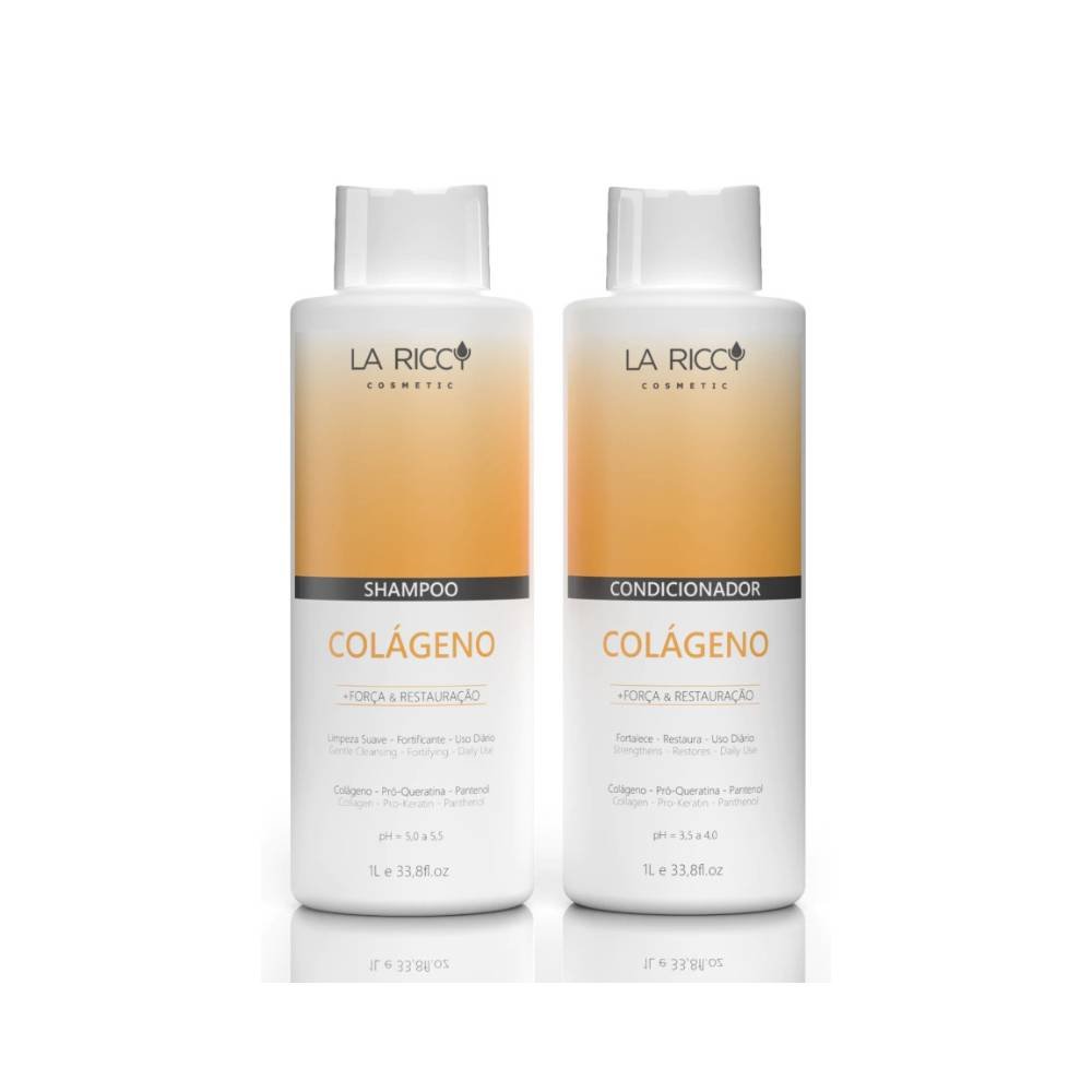 O Kit Colágeno Força e Restauração La Riccy 1L fortalece e repara os fios danificados, devolvendo resistência e brilho. Enriquecido com colágeno hidrolisado, hidrata e restaura a estrutura capilar, prevenindo quebras. Ideal para cabelos fragilizados e sem vida, proporciona maciez e movimento saudável.