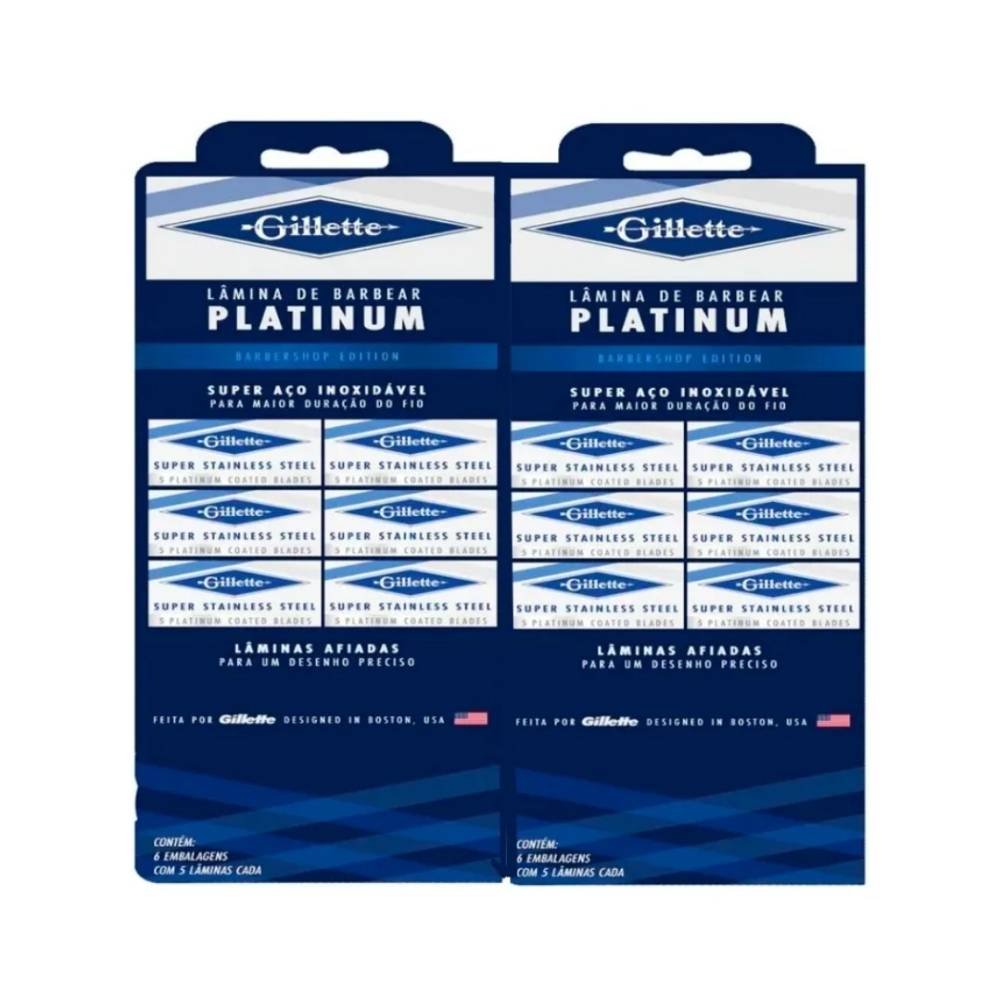 A Lâmina de Barbear Gillette Platinum é uma opção de alta qualidade para quem procura um barbear preciso e duradouro. A embalagem contém 20 cartelas, cada uma com 5 lâminas, totalizando 100 lâminas. São lâminas inteiras, feitas de super aço inoxidável, o que as torna duráveis e resistentes à corrosão. Projetadas na edição Barbershop Edition da Gillette (marca originada em Boston, EUA), as lâminas são afiadas para um desenho preciso, proporcionando um barbear suave e limpo. Elas oferecem uma maior duração do fio em comparação com outras marcas, e são compostas de aço inoxidável revestido de cromo e politetrafluoretileno, garantindo resistência e deslize suave durante o barbear.: